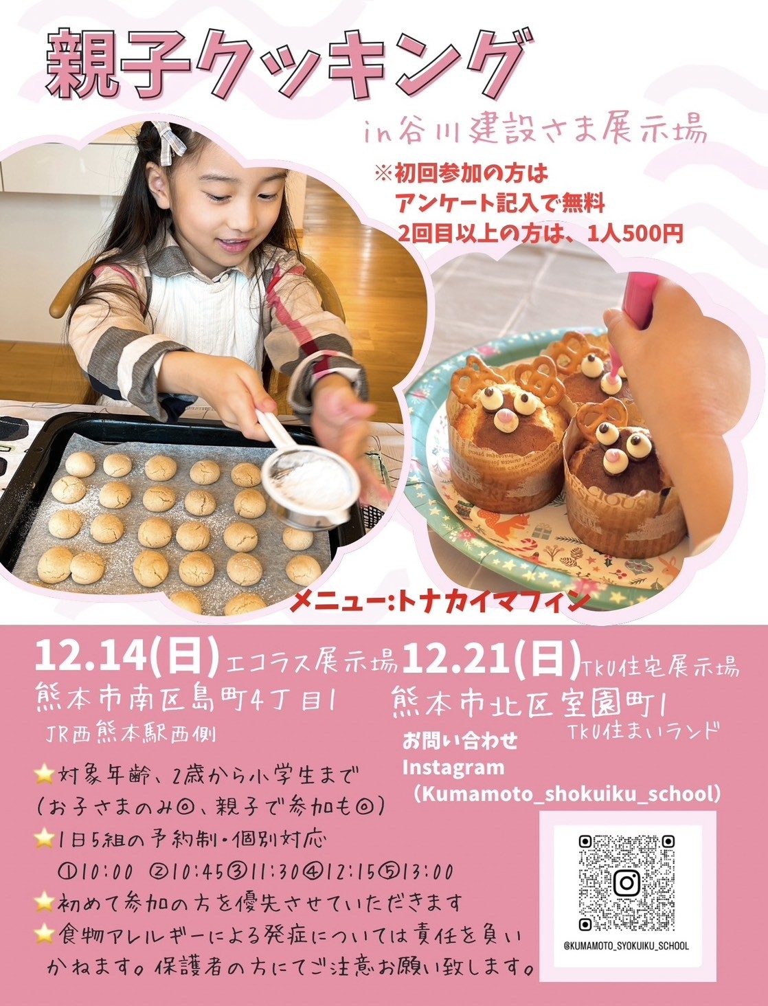 12月14日(日)総合住宅展示場エコラスにて、21(日)TKU住宅展示場住まいランドにて、「熊本食育スクール」のあいか先生による食育イベント【トナカイマフィン親子でクッキング】を開催いたします