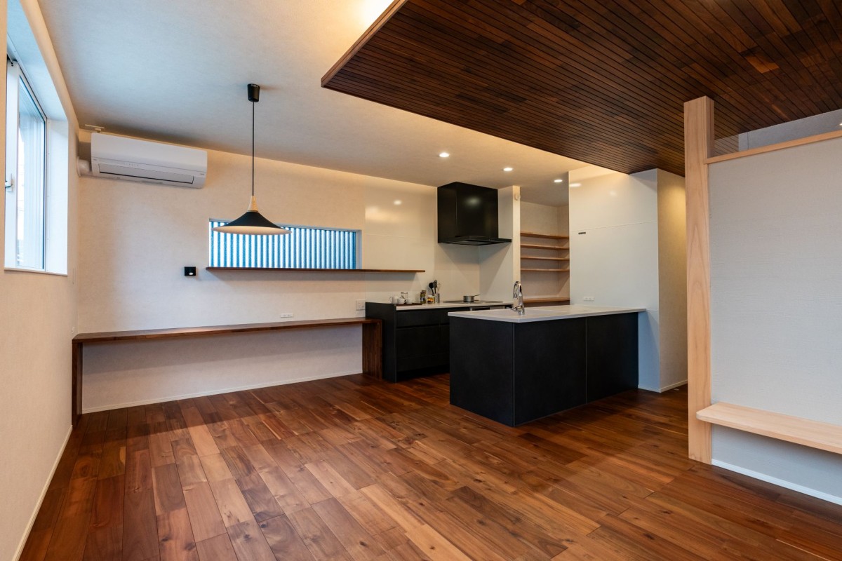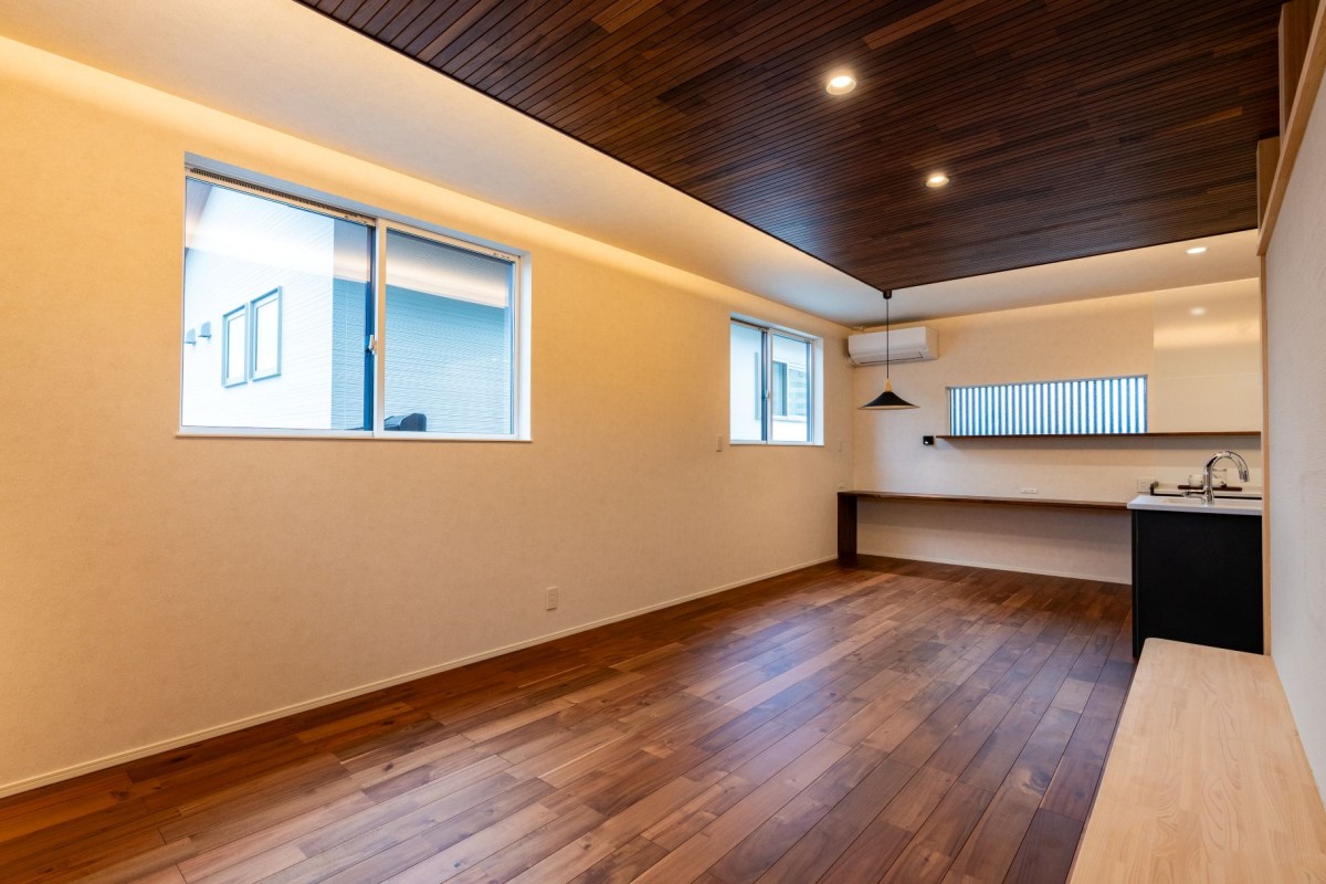 - 2階リビング×内装はシックな色使いにアカシアの床で仕上げた約17帖LDK
