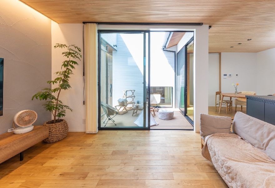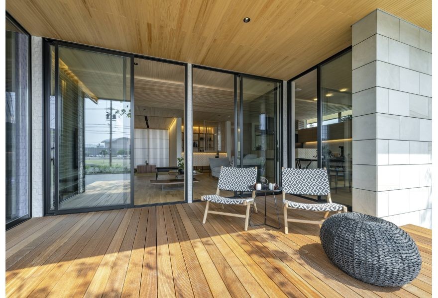 ・L字型のLDKに沿って窓を設けることで、明るく爽やかに風を取り込みます。タイルテラスではBBQやプール遊びも楽しめます。
