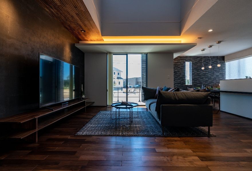 ・無垢の下がり天井に間接照明を合わせ、洗練されたリビング