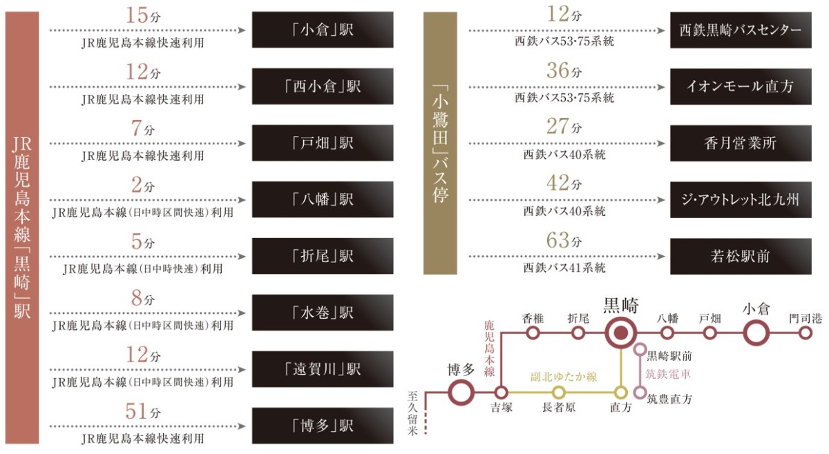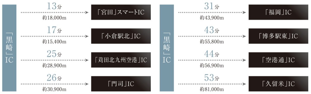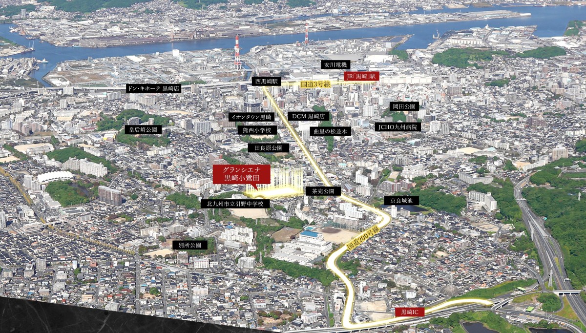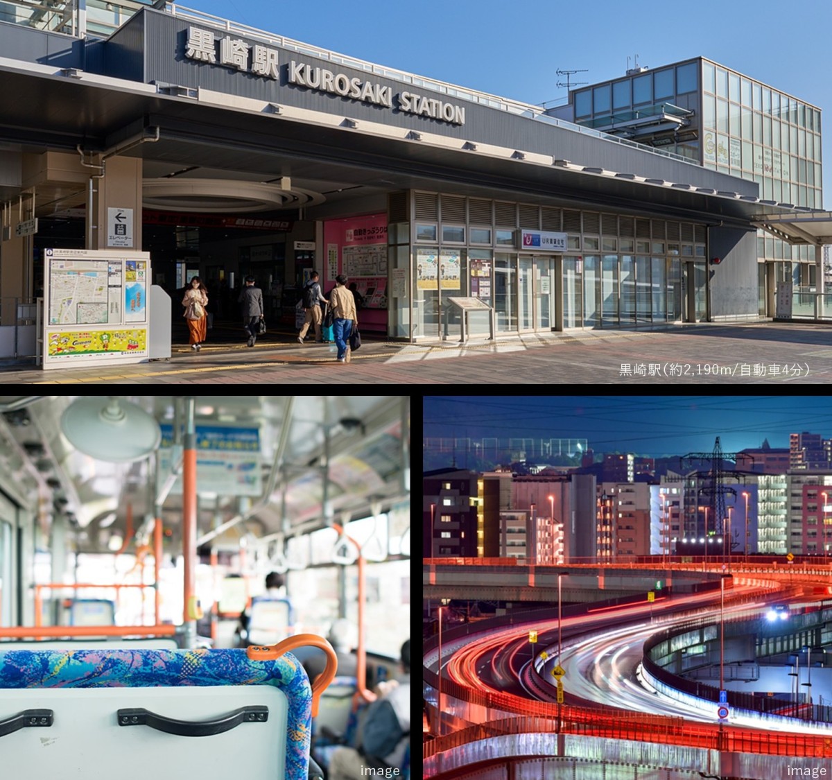 市内とその周辺地域をカバーする北九州都市高速「黒崎」I.Cまでは、現地から車で約2分という距離。高速までの快適なアクセスが軽快な日常を叶えます。