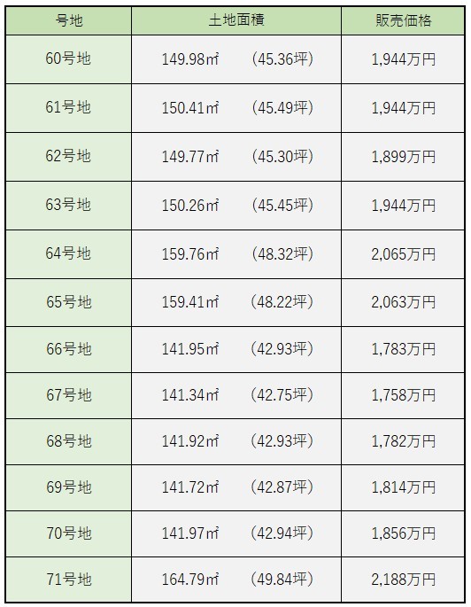 ※建築条件付分譲について:この土地は土地売買契約締結後、3ヶ月以内に当社と住宅の建築請負契約を締結して頂くことを条件として販売いたします。この期間内に住宅を建築しないことが確定したときまたは、住宅の請負契約が成立しなかった場合は、土地売買契約は白紙となり受領した金額は全額お返しいたします。