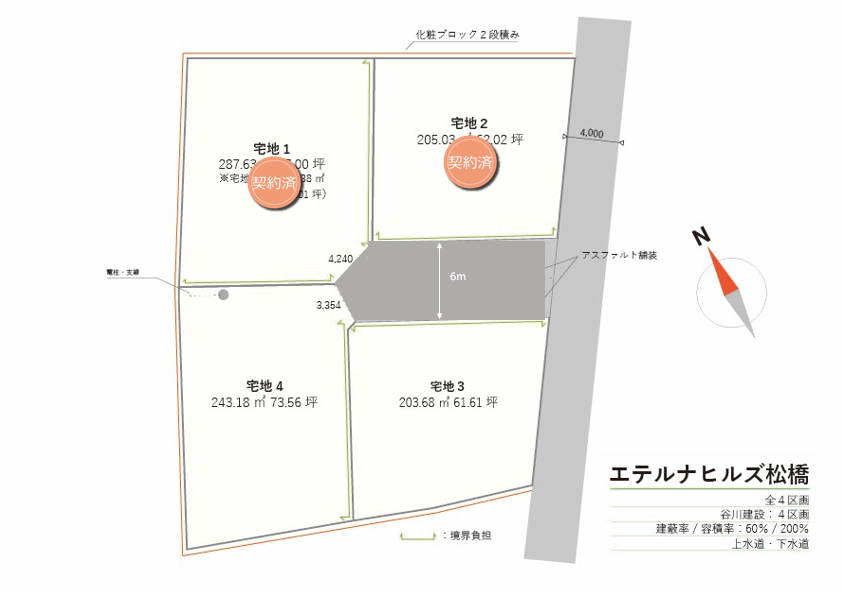 ○境界ブロック費用は買主負担 ○宅地①と宅地④の通路部分には通行地役権をお互い設定します